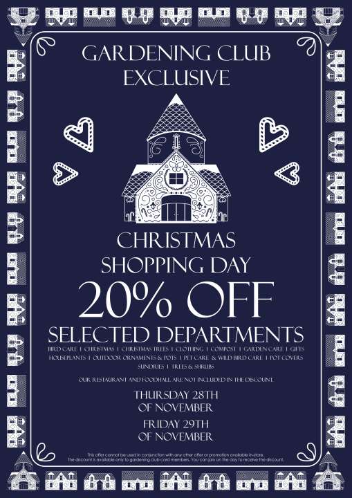 A day you'll want to clear your calendar for! We will be offering 20% off nearly all departments* to our Gardening Club Card customers for our Christmas Shopping Day.
